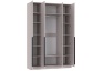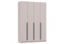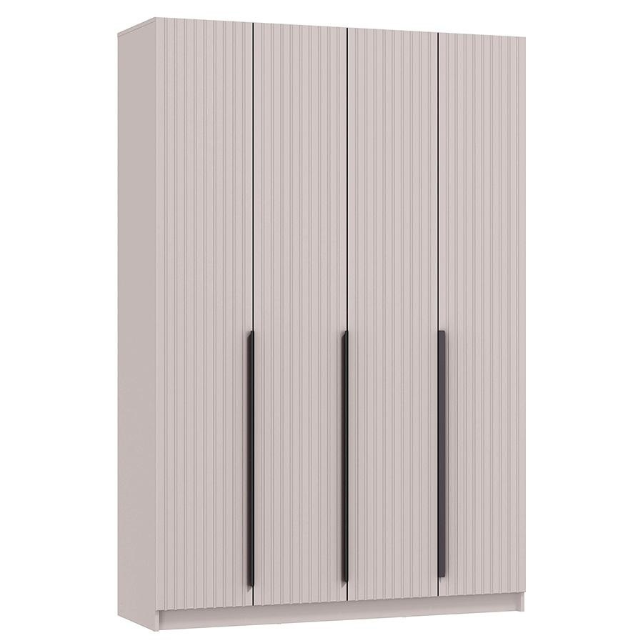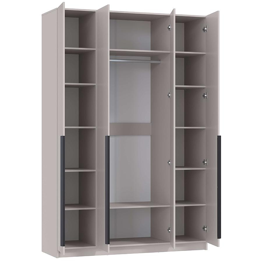 Шкаф 4-х дверный 67.13 Брандо высотой 238 см в цвете кашемир (матовый), фасады из МДФ с рельефными вертикальными углублениями. Три чёрные металлические ручки (скоба) на крайних и одной центральной двери; вторая центральная дверь открывается за край. Двери с доводчиками. Внутри расположены три отделения: в центре – широкое: вверхней части полка, под ней – металлическая штанга для одежды, а за правой и левой дверями – по пять полок для хранения вещей.
