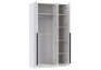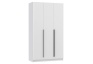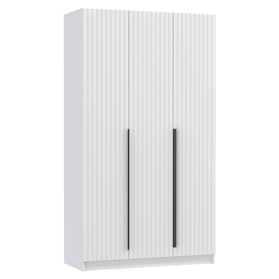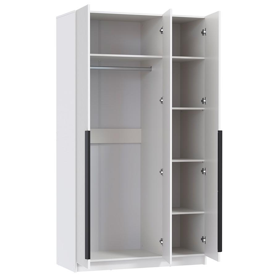 Шкаф 3-х дверный 67.15 Брандо высотой 215 см белого матового цвета , фасады из МДФ с рельефными вертикальными углублениями, создают эффектную игру света и тени. На правой и левой дверях – чёрные металлические ручки: торцевые (крепятся к торцу двери), центральная дверь открывается за край. Двери с доводчиками. Внутри два отделения: за левой и центральной дверью – широкое, с верхней полкой и металлической штангой для одежды, а за правой дверью – четыре полки для хранения вещей.