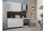 Кухня Деми длиной 120 см с фасадами белого цвета и белым корпусом (более подробные изображения см.здесь). В этот комплект входит столешница толщиной 28 мм с текстурой «Дуб натуральный».