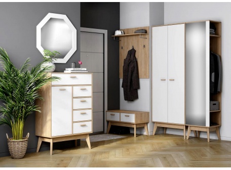 Мебель для прихожей Калгари выполнена в скандинавском стиле с корпусом ЛДСП цвета светлого дуба и белыми матовыми фасадами из МДФ. Прихожая содержит группу модулей из которых вы сможете составить мебельную композицию для помещений различных по площади и конфигурации.