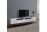 Подвесная тумба Прага с белым корпусом и фасадом бетон пайн белый (ЛДСП), в её центральной части расположена широкая секция, разделённая на четыре части: сверху открытая ниша, ниже – откидная дверь. По бокам тумбы – распашные двери