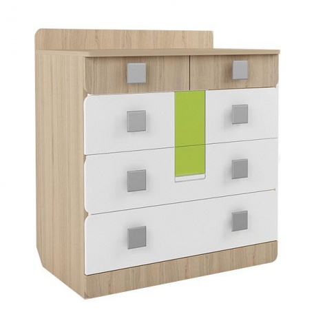 Комод Стиль с четырьмя ящиками на шариковых направляющих полного выдвижения. Материал корпуса ЛДСП, фасад комода и декоративные накладки (цвет лайм или кофе). Здесь используются пластиковые ручки.