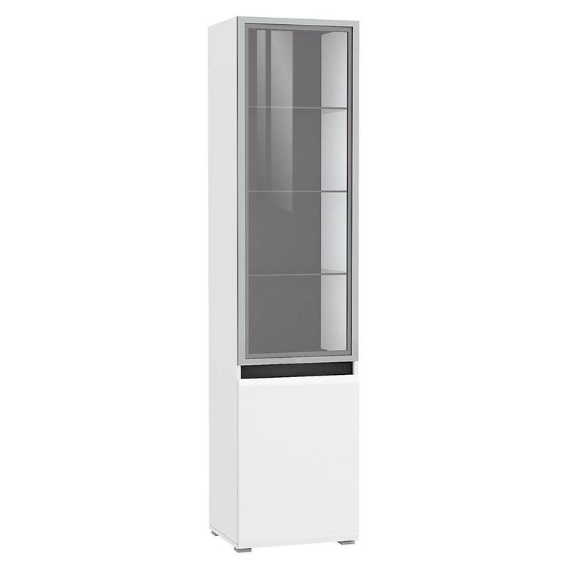 Шкаф-витрина Сидней 13.201 можно собрать на любую сторону, внутри расположены 5 полок (три верхние – стеклянные). Фасады дверей с доводчиками и механизмом push-to-open: открываются за край либо нажатием.